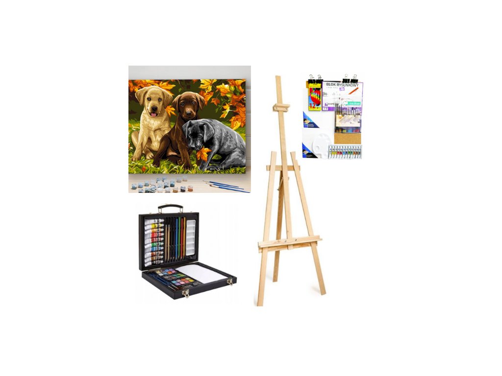 V setu najdete malířský stojan a k němu vše potřebné pro první krůčky vašeho umělce.