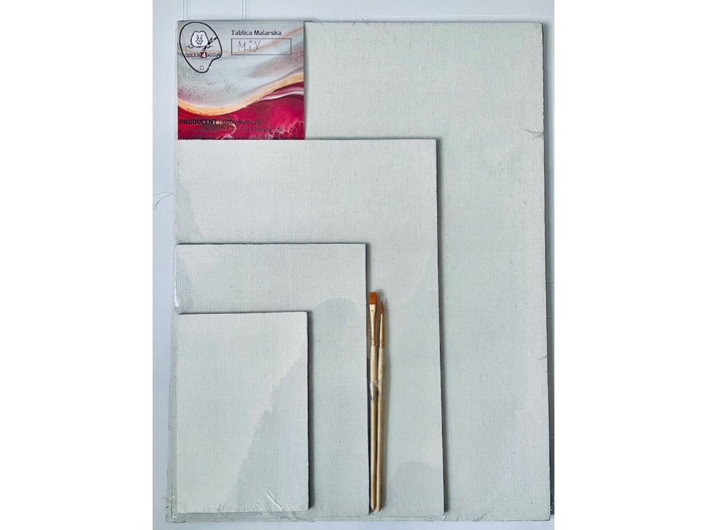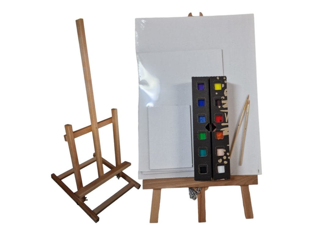 Součástí setu jsou čtyři desky potažené plátnem a sada barev.